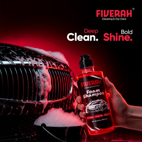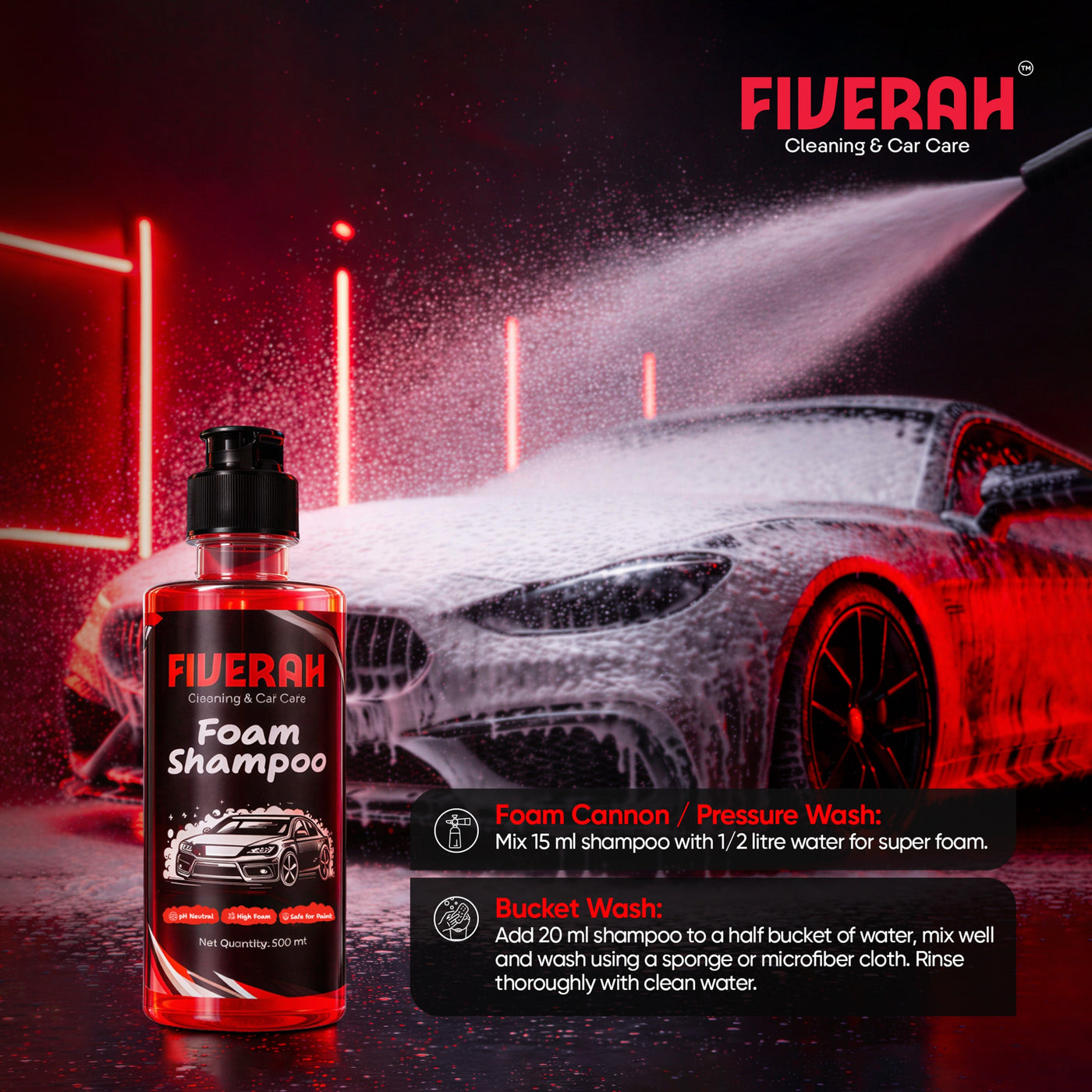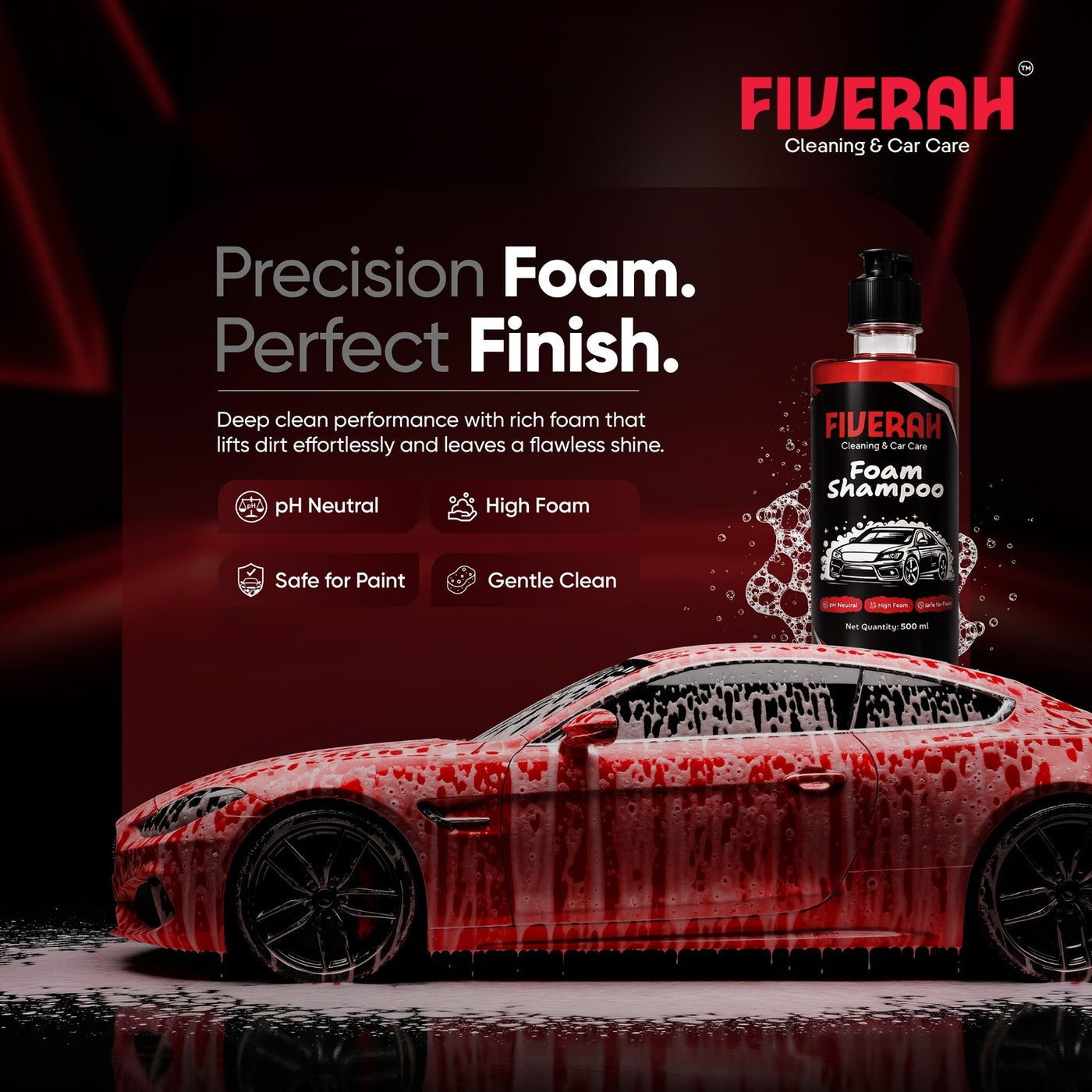 Fiverah Foam Shampoo is a premium car wash solution designed to safely remove dirt, dust, and road grime while protecting your vehicle’s paint. Its rich foam formula lifts contaminants without causing scratches, leaving a clean and glossy finish.